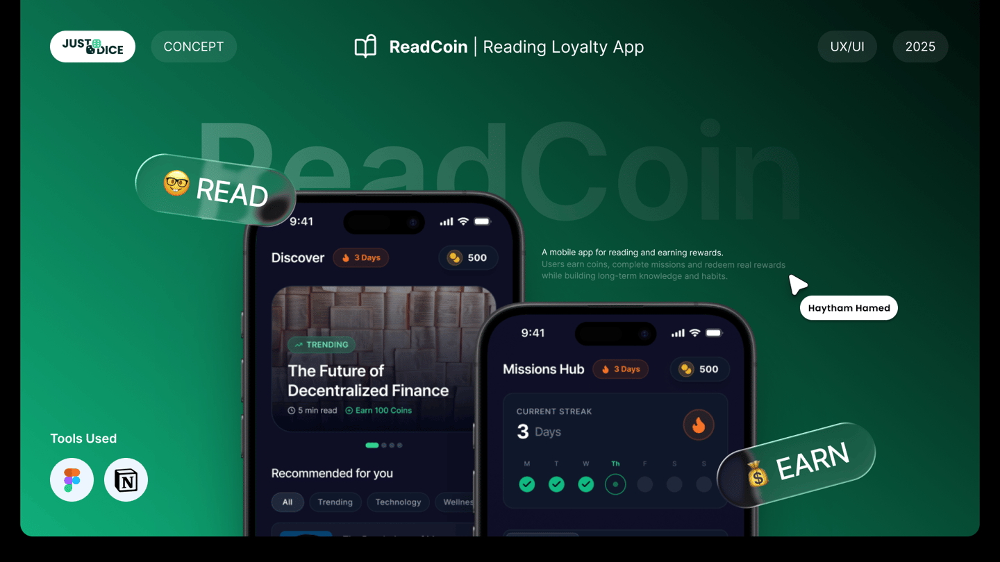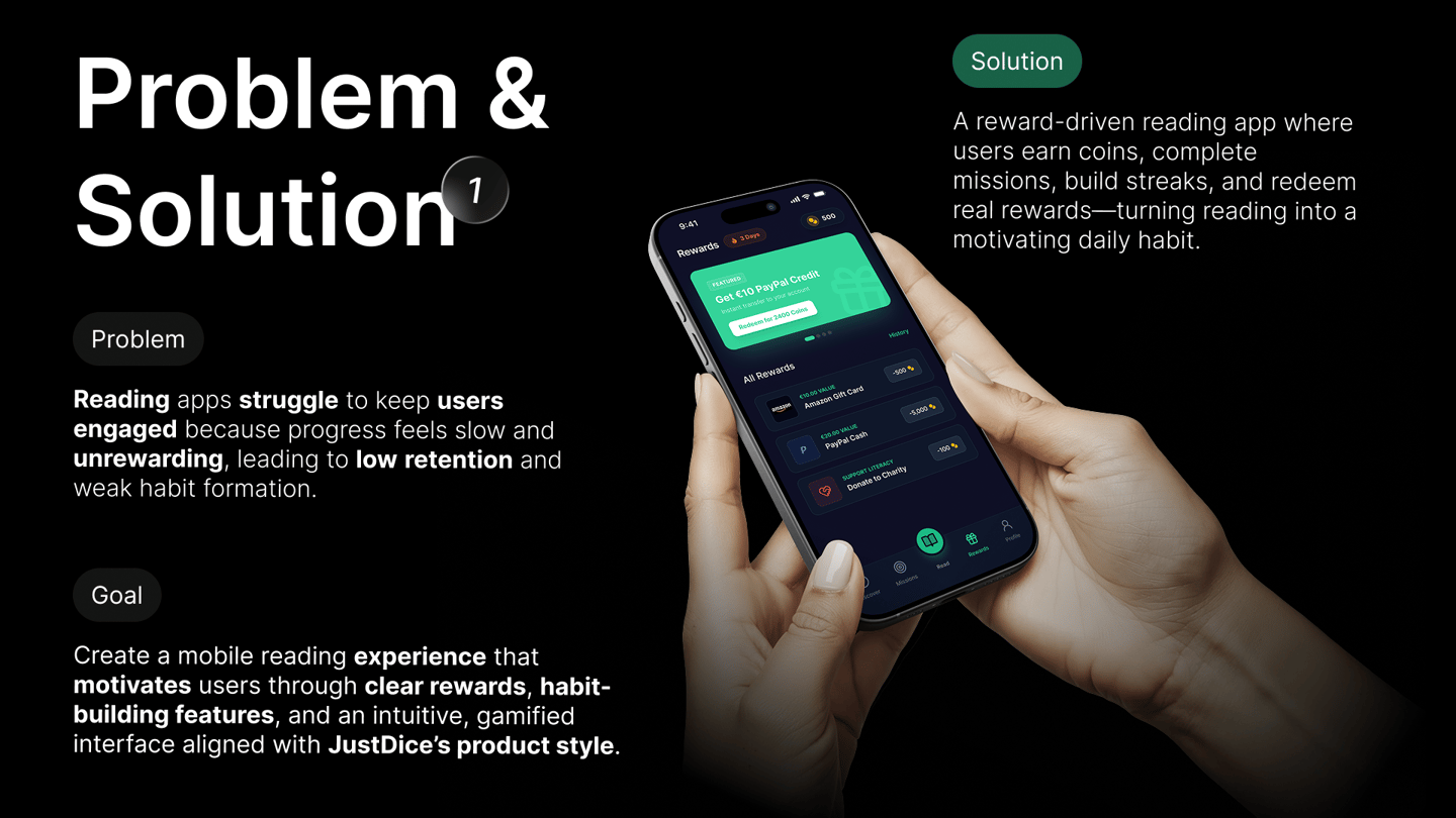 A concept UX/UI design project for JustDice, exploring a gamified reading and rewards experience that encourages habit formation and long-term user engagement.