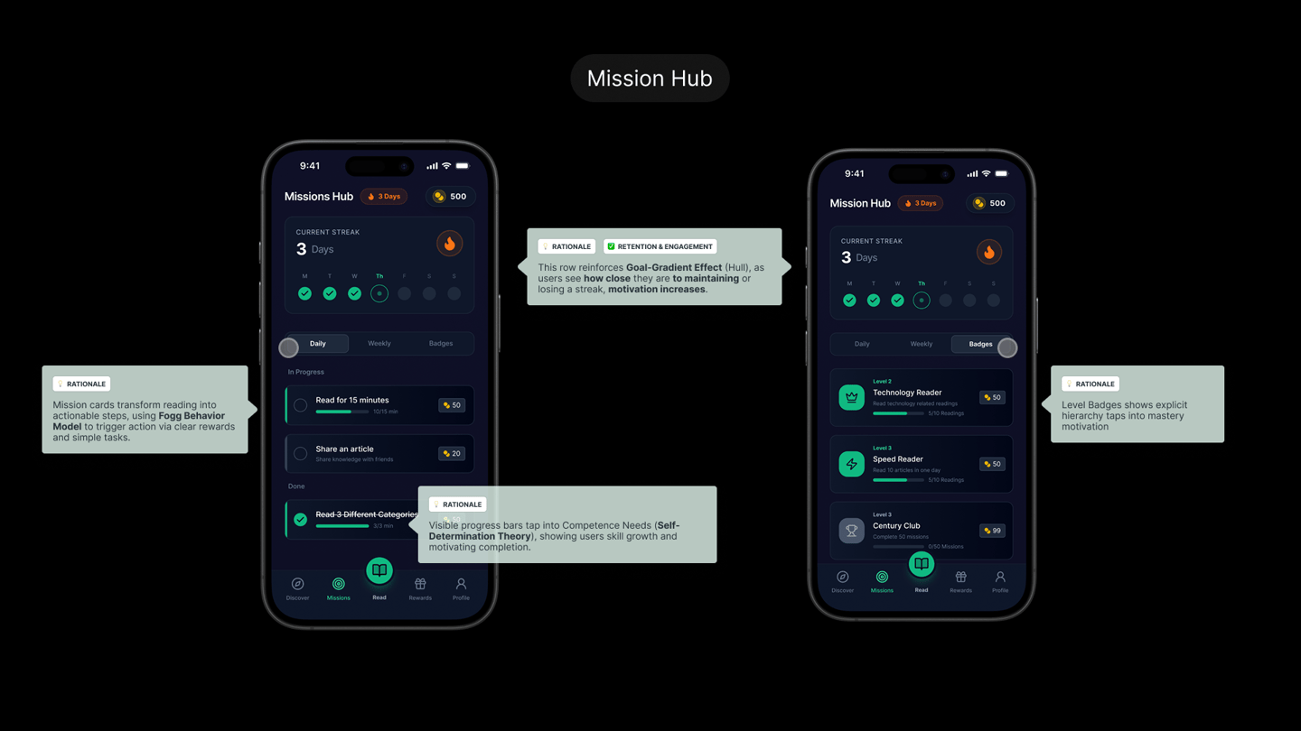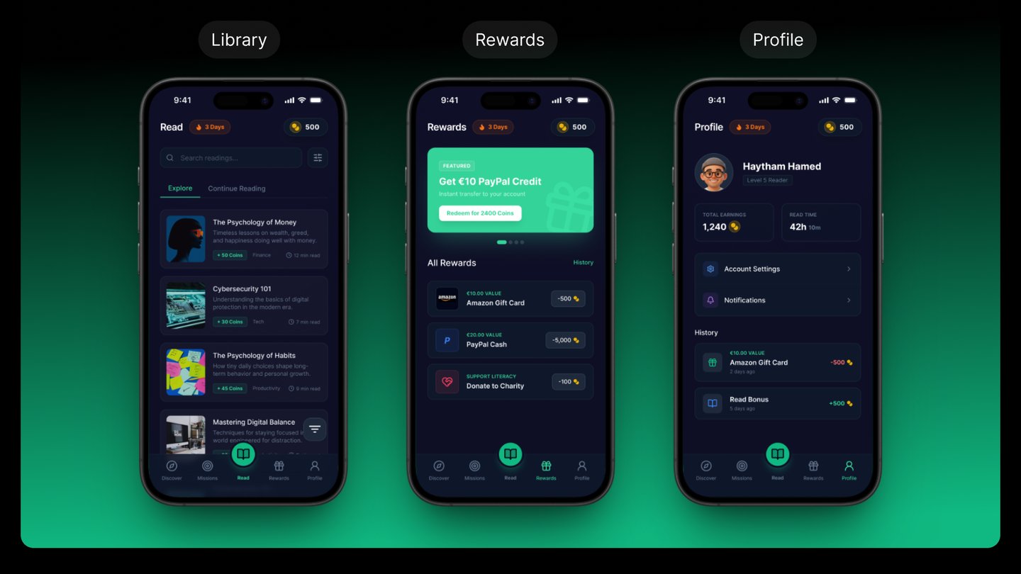 A concept UX/UI design project for JustDice, exploring a gamified reading and rewards experience that encourages habit formation and long-term user engagement. The concept focuses on motivation mechanics, clear reward systems, and a lightweight, intuitive mobile interface aligned with JustDice’s product ecosystem.